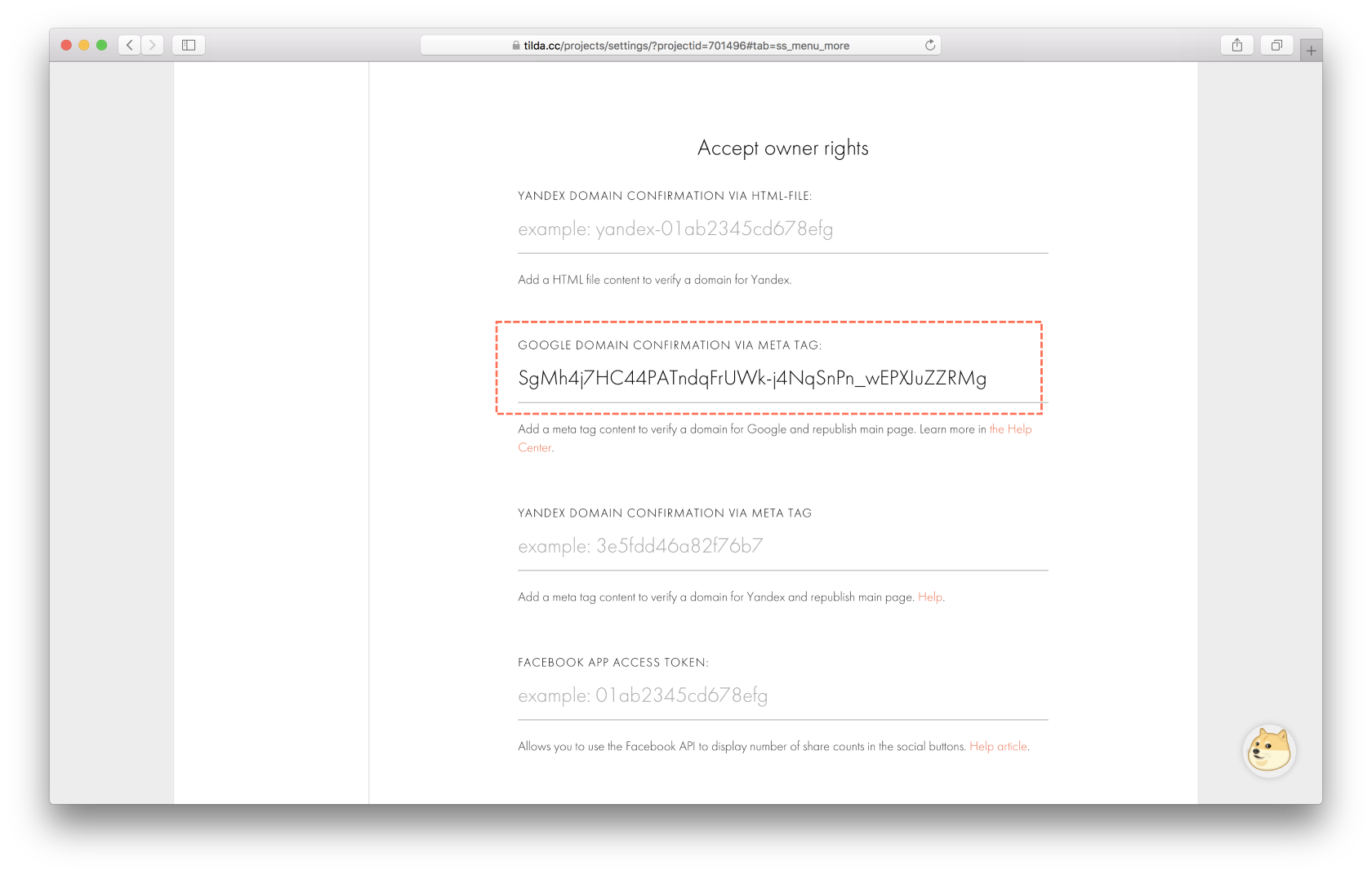 - Go to Tilda. Open Site settings → More → Confirm ownership. Add the meta tag in the line Google Domain Confirmation. Save the settings and publish the site.