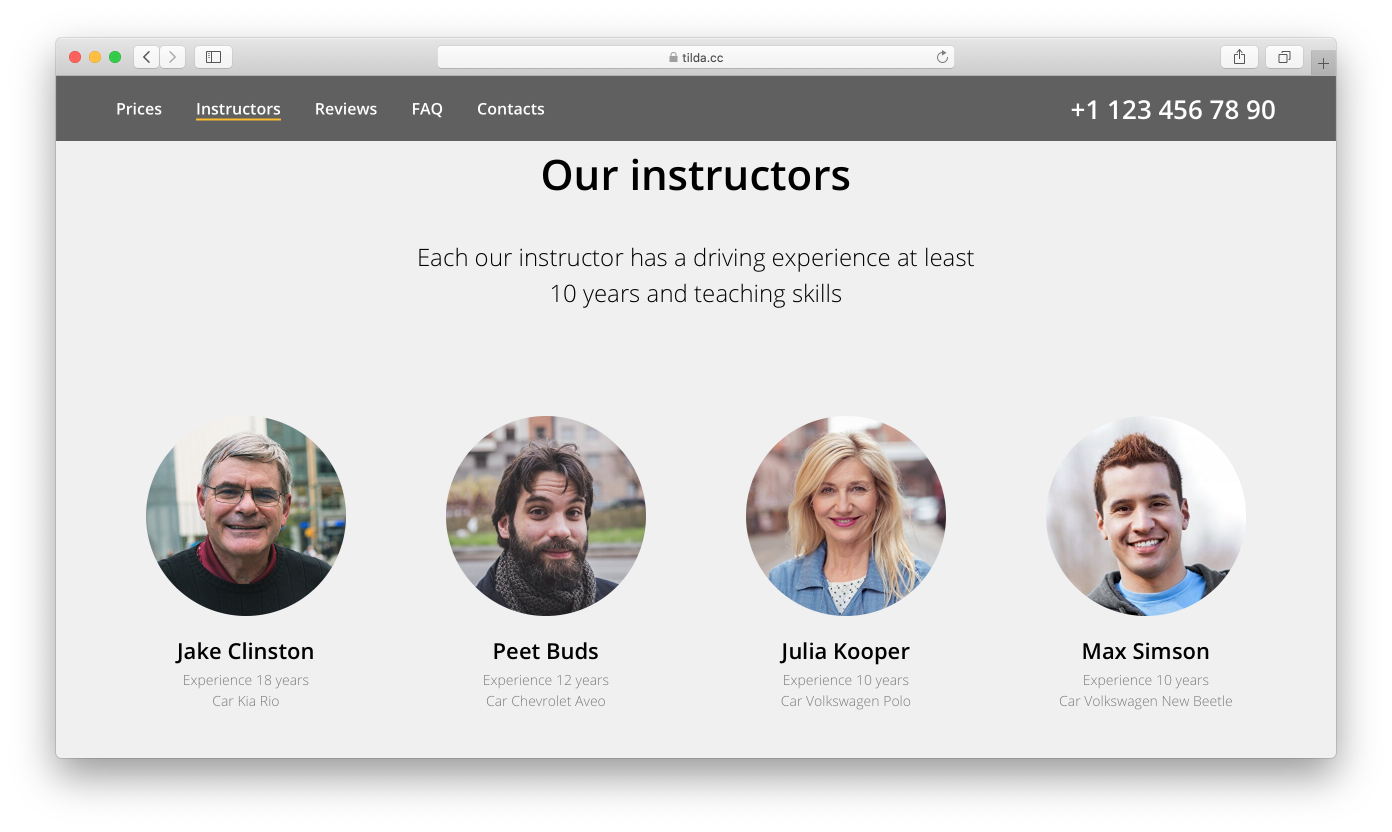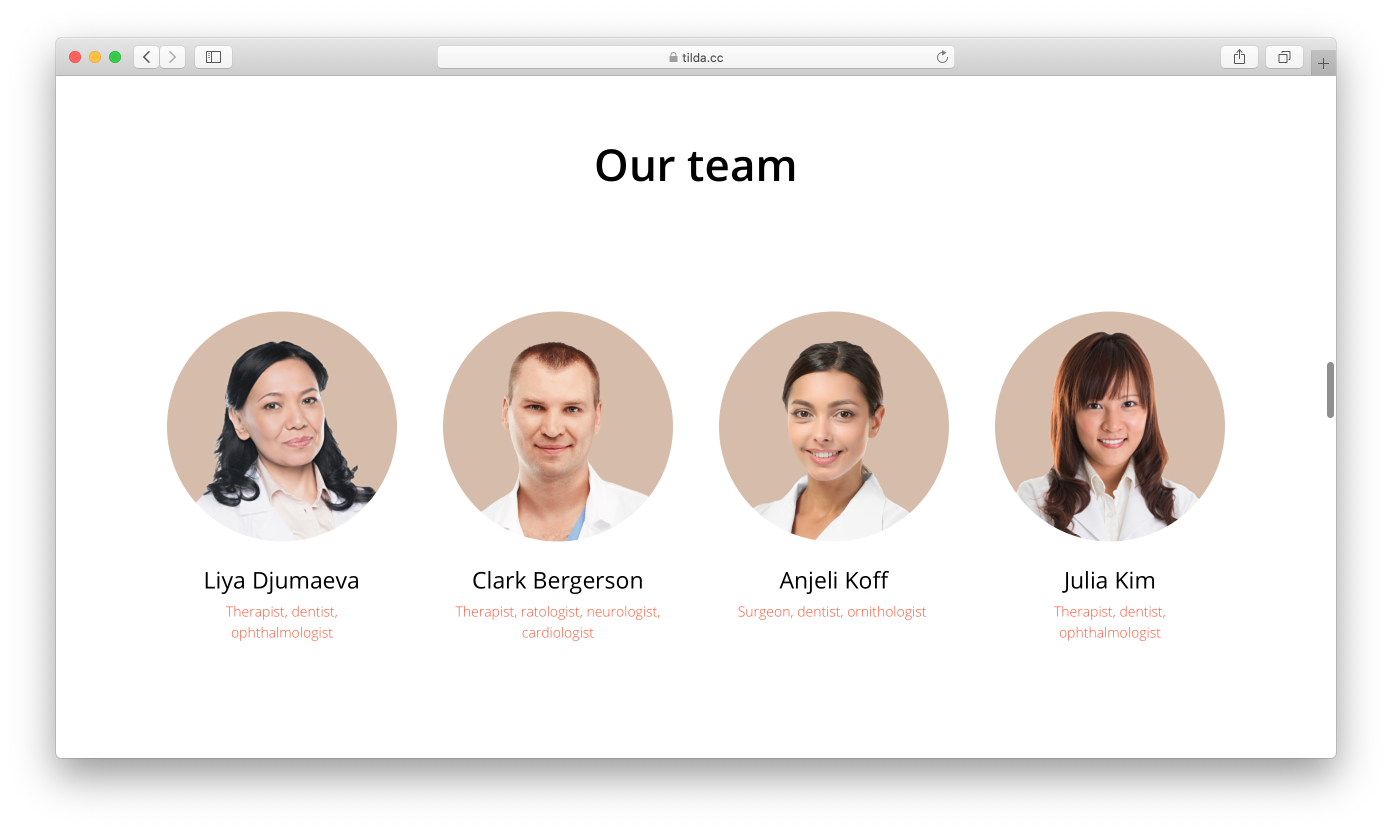 It's best if the visual style of the headshots matches the overall landing page style. Also, consider the sphere of your business when choosing a style: Photos taken during expeditions may be appropriate for a travel guide, while doctors should opt for a more professional, neutral background.