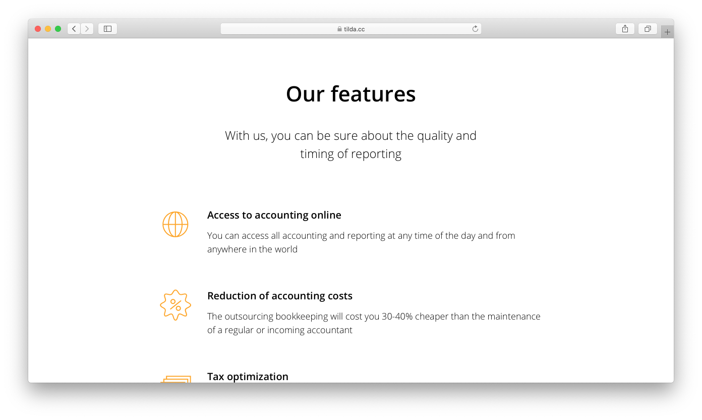Usually, several short sentences are enough to outline your advantages. They are often accompanied by icons, simple illustrations, or images.