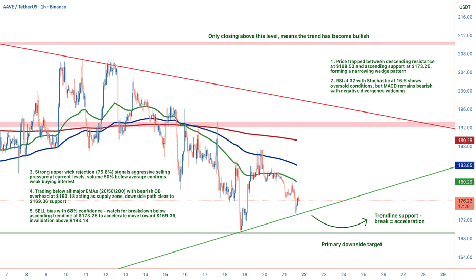 AAVE: The Squeeze Is OnWe're watching a textbook compression pattern on AAVE—price trapped between ascending support at $173.25 and descending resistance at $198.53. These narrowing wedges don't last forever. The question isn't if it breaks, it's which direction and how violently. Current price: $175.48.