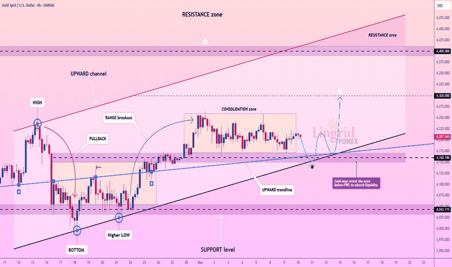 Lingrid | GOLD Weekly Outlook: Pause Before the Next Surge OANDA:XAUUSD push toward the $4,400 psychological barrier encountered resistance, stalling just shy of a decisive breakout as market momentum softened ahead of the year-end holidays. This is not a reversal, but a classic consolidation—a necessary pause to digest gains and reset for the next leg hig