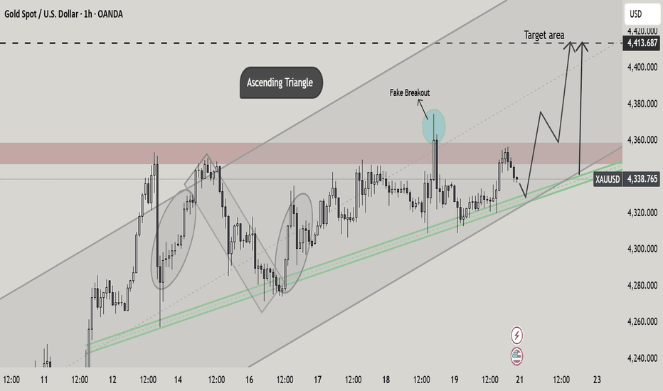 Ascending Triangle After Fake Breakout Bullish Continuation This 1-hour Gold (XAUUSD) chart shows a well-defined ascending triangle structure within a rising channel. Price continues to respect the ascending support trendline, forming higher lows while pressing against a key resistance zone.