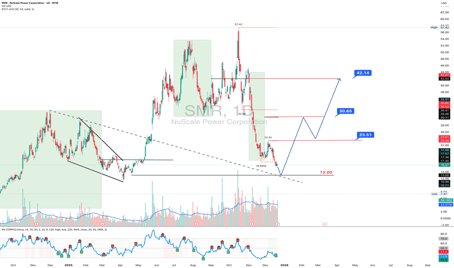 SMR 1D: Small reactors. Big nerves.I am looking at NuScale Power without emotions. After a strong impulsive move, the price is in a deep correction phase and is now forming a base. The key focus is not old trendlines, but current market behavior. On the daily chart, RSI reached oversold levels and started to turn up, while price is n