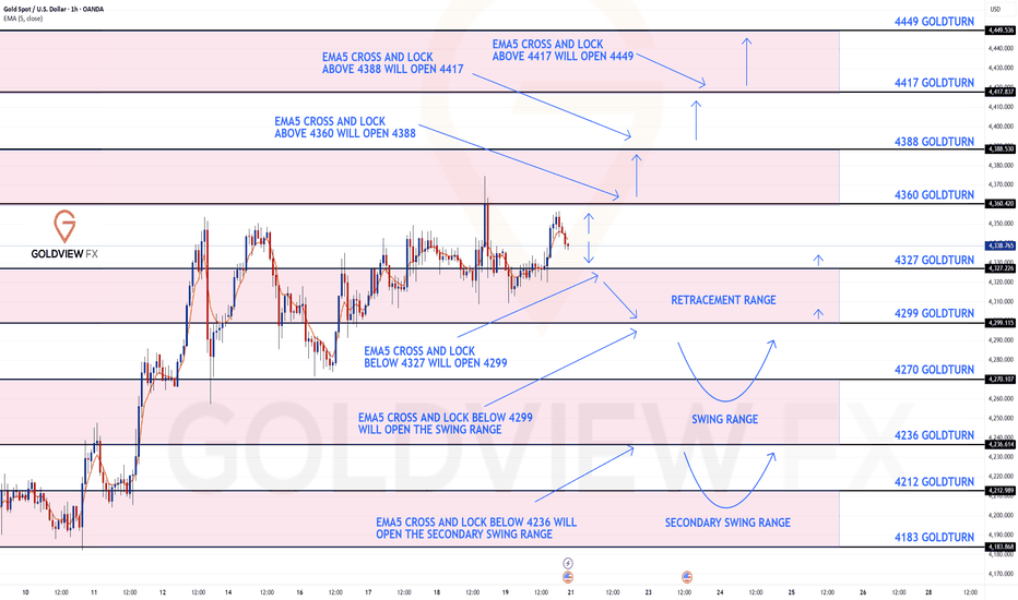 We are seeing price play between two weighted levels with a gap above at 4360 and a gap below at 4327, as support. We will need to see ema5 cross and lock on either weighted level to determine the next range.