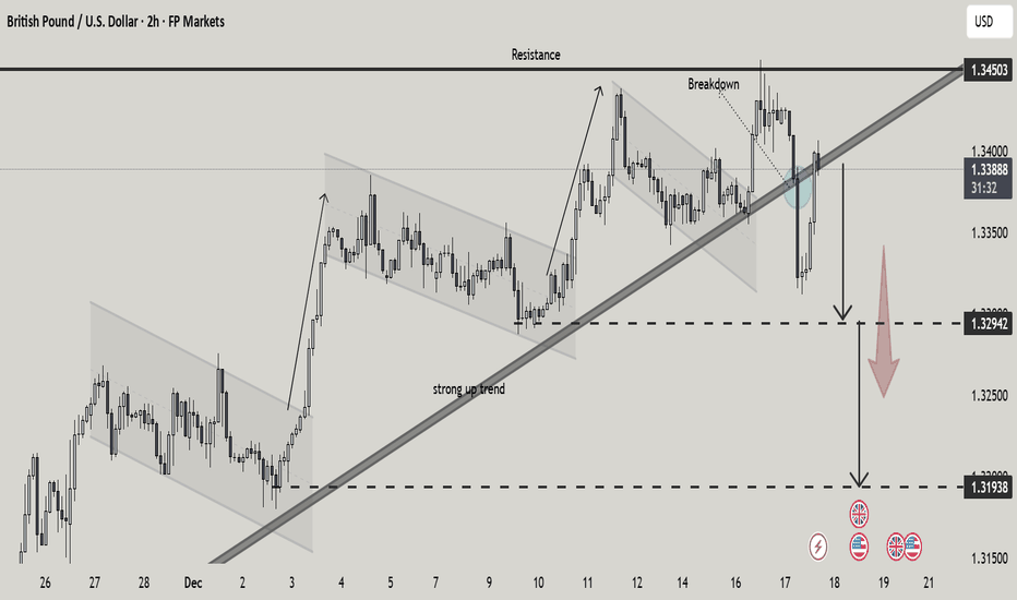 GBPUSD Trendline Breakdown Deeper Pullback from Key ResistanceThis 2-hour GBP/USD chart highlights a strong bullish structure built on a rising trendline, with price respecting higher lows throughout early December. Multiple ascending and corrective channels show controlled upside momentum.
